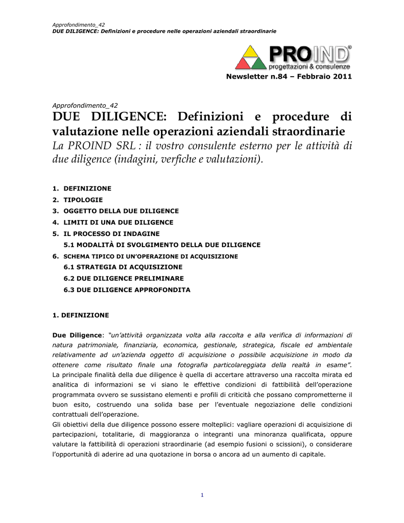 PDF Due DILIGENCE 1- FULL DUE DILIGENCE DEFINIZIONI: 1. Letteralmente tale terminologia, di chiara origine anglosassone, è l'abbreviazione del termine "due diligence review" e potrebbe essere tradotta come "diligenza dovuta" da un professionista, che svolge un incarico professionale affidatogli dal cliente.